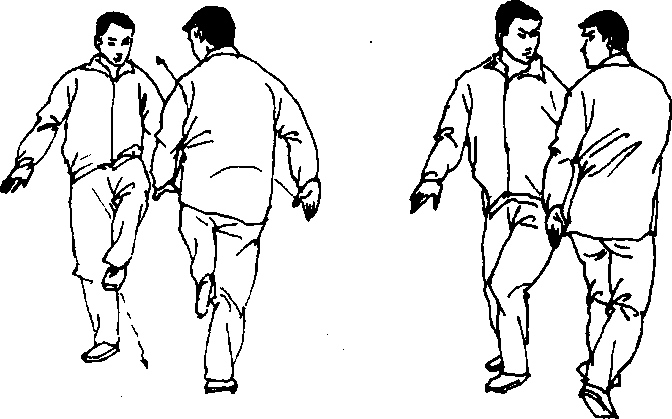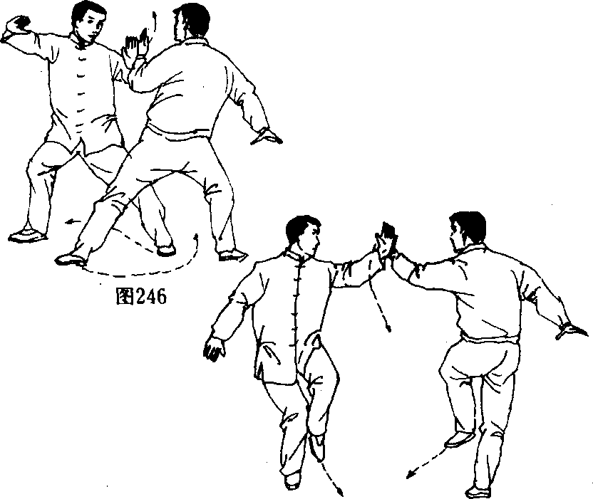 乙左手握甲左手腕向下、向后采甲左臂;同时,甲乙左脚 提起。(图250)