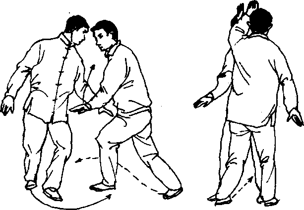 【要领】“绕步缠臂采靠“是手、眼、身法、步的组合练 习。手法要缠绕不脱;身法是双方侧身相对;步法是弧形摆扣 步;眼法是随两手臂缠绕而环视。