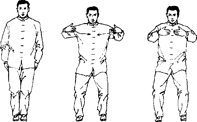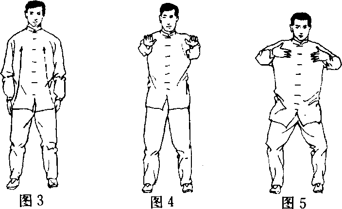 两脚平行开立,与肩同宽,两腿屈蹲,重心落于两脚中间, 两臂屈抱于胸前,手指微屈自然展开,指尖相对(相距约10厘 米),掌心向里,如抱球状;目视前方。(图3、4、5)