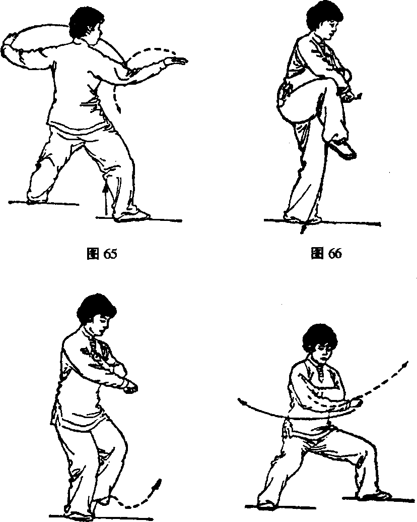 ① 身体微左转,重心稍左移;同时两臂向两侧伸展,左 手内旋手心斜向下;右手外旋,手心翻向上;接着身体右 转,重心全部移于左腿;右脚蹬地屈膝提起,脚尖自然下 垂;随之右臂屈肘,右掌内旋变拳向上、向左、向下收至腹 前,拳面斜向下;左臂屈肘,左掌外旋向上、向右、向下, 与右手在胸前相合,左掌扶于右前臂上;眼看前下方(图 65~图66)。