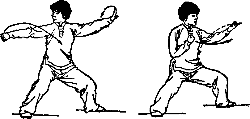 ③ 身体右转,重心稍左移;同时左手微外旋;右手微内 旋,分别向左上、右下弧形分开,左掌心向外;右拳心向 后;接着身体微左转;重心稍右移;随之右臂屈肘,右拳外