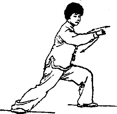 ④ 身体微右转后再急促左转,随之重心迅速左移成左弓 步,右腿微屈;同时左手快速收于左肋侧,手心轻贴左肋; 右拳随转体后拉蓄劲,然后内旋经左臂上向右前方(东南) 急促发出,拳同肩高,臂微屈,拳心向下;眼看右拳(图 71)o