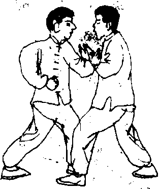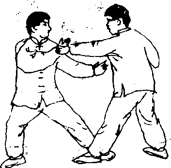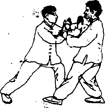 图 2 — 157图 2 — 157设敌左脚前上一步,其右 手粘我右腕,左手粘我右前 臂,前推时;我左脚前上步洞 时左手从右臂之下,敌两臂内 侧前上伸(图2—157)。紧接 着,我左大臂上抬敌右腕,左 手下扒拉敌右腕,以解脱敌两 手的推按(图2—158),动作 不停,我两手粘住敌右前臂向' 敌胸部猛力推按(图2—