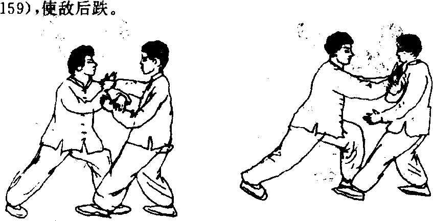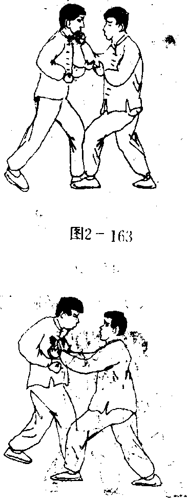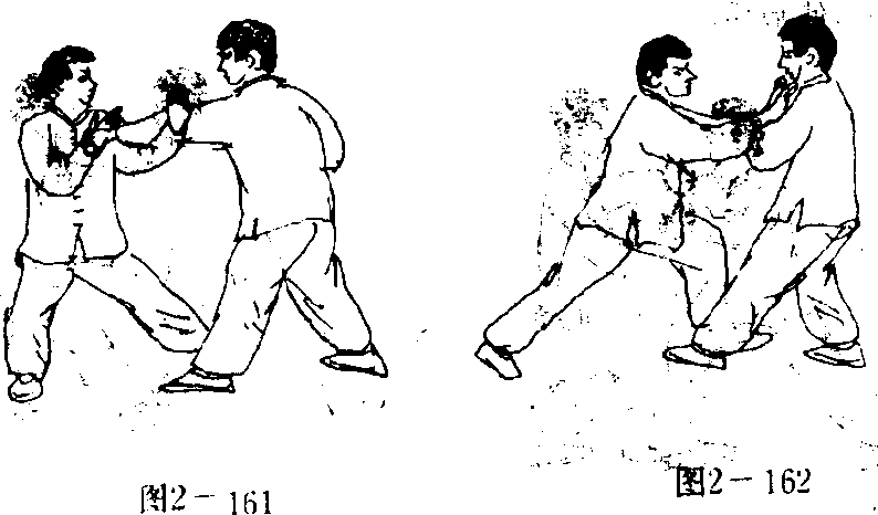 设敌左脚前上二步,同时 用左掌向我胸部推击而来;我 右脚右前上厂步胃同时:捐右手 粘其腕稍向有下压.(图2— 160)。紧接着,?我左手从敌左 臂下前伸w并向上抢故职图、 2—1?1).0当莪在肘关节受 制,而屈臂回抽时;;琪两手随 其暨,向前止椎击馥%使敌 后'仰(图 2^152)0 r ; 1