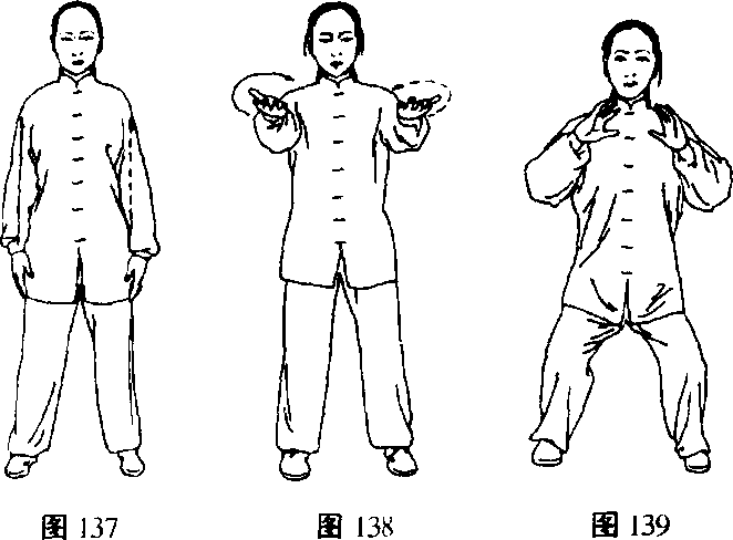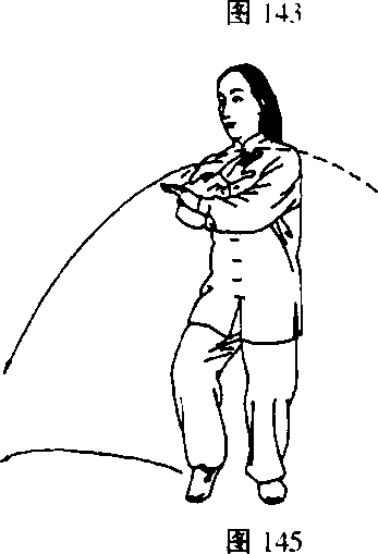 两臂随体合于胸前(右下左上),两掌心向下,目视两 掌(图145)o