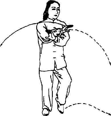 重心移向左腿,左脚踏实,收提右脚于左脚内侧 (不着地),右掌向前弧形撩至右腹前侧,腕微屈,掌心 斜向上,左掌弧形收落于左胯旁,掌心向下,指尖向 前,目视右掌(图143) o