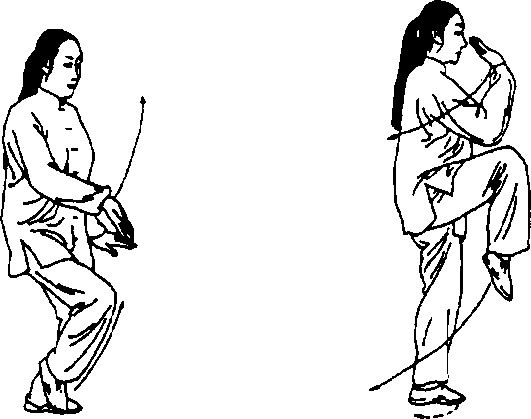 左脚舒伸,身体立起,右腿提膝,高过腰;同时右 臂屈肘,右掌内旋,掌指后转,掌心斜向上,托至下颁 高,左掌稍沉按,目视前方,成势向东(图144)。