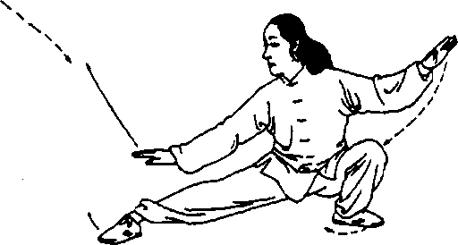右腿向下屈蹲,膝部外展,左腿向左前仆步,脚尖 内扣;同时两臂分别向体侧弧形分展按落,左掌指向 左(东),掌心向下,腕与腰同高,右掌指向后(西偏 南),腕微屈与肩平,掌心斜向下,目视左掌方向(图 141 )o