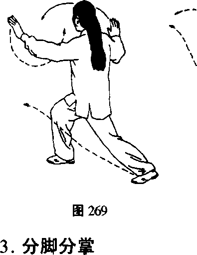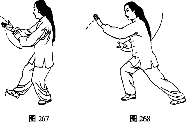 下,右掌向右上摆弧成侧前举,左掌稍低,掌心斜向 下,右掌心斜向上,目随视右掌(图269)0