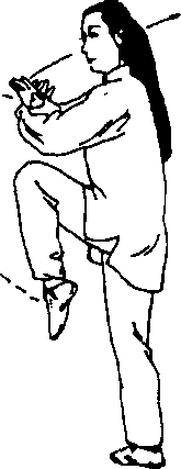 上体微左转,左腿屈膝提起;同时两臂继续弧形 绕摆,两腕上下相搭于胸前(右上左下),两掌心向侧 前,目视左前方(图270)。