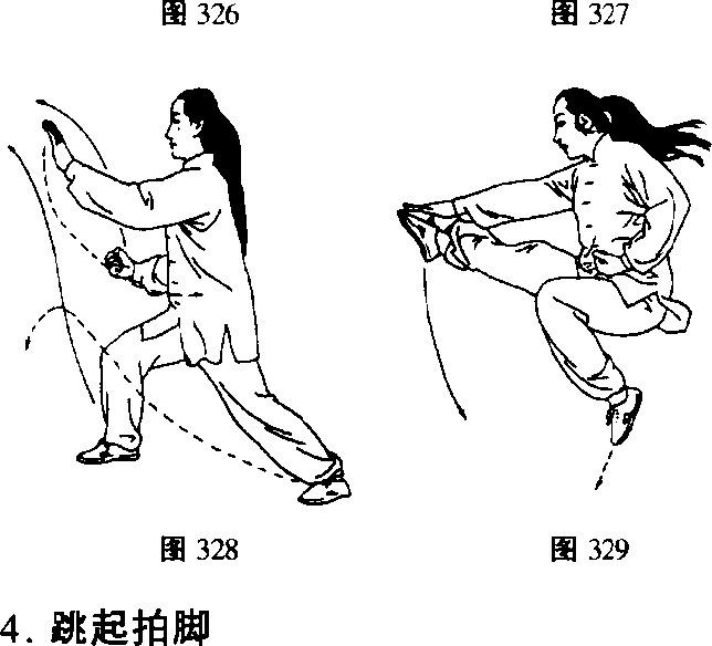 右脚蹬地,身体随左腿上摆腾起,右腿随即前摆, 脚绷平;右拳变掌向前拍击右脚面,同时右掌变拳收 于腰间,成势向西(图329)。