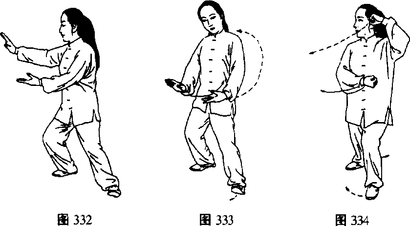重心前移成左弓步;随上体右转两掌变拳,右拳 置于左肋旁,拳心向上,左拳随体转划弧收于左额旁, 拳心向下,拳眼向里,两拳心上下相对,目视右前方, 成势向南偏东30。(图334)。