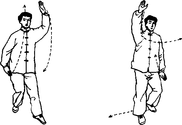 3. 接上动,右腿向后撤一步,先前脚掌踏地后全 脚踏实,身体重心移至右腿;右手向下捋至右胯旁掌 心向下,左掌向体前上举掌心斜向前,与眼平;目视 左掌(图74)。