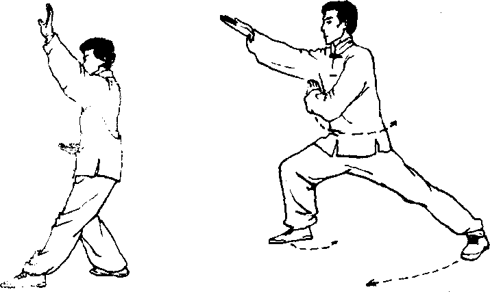 4. 接上动,上体右转45。,左腿向后蹬脚,右腿 向右后45。上步成弓步;左掌随转体向右摆成横掌,右 掌由左臂上向右前穿出;目视右掌(图75).-