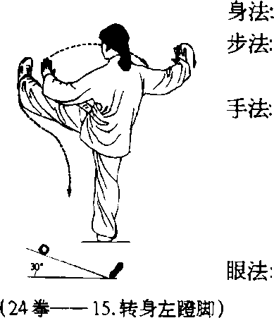 (二) 本式是右蹬脚的反向拳式,左蹬脚的方向是西偏北约 30° ,与右蹬脚恰成180° 0