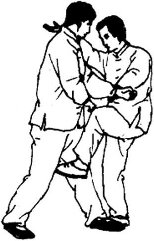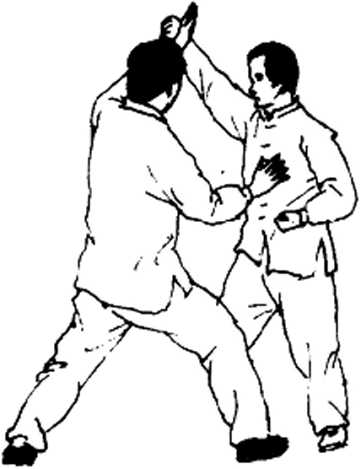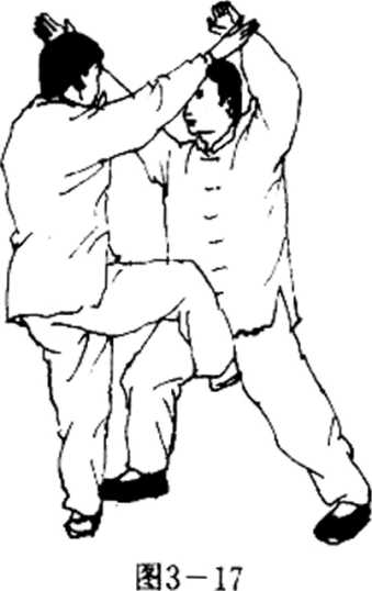 甲乙两人对面站立。乙左脚前进一步,伸左崩 拳直打乙腹部;甲右臂呈斜圆形运动由外往内再往 右斜F方掩盖搂抱乙左臂腕,同时微转体,借右臂 勾抱和转体之势带起左腿挑击乙裆。(挑击之脚要大 足耻一侧朝向斜上方)(图3 — 21)。