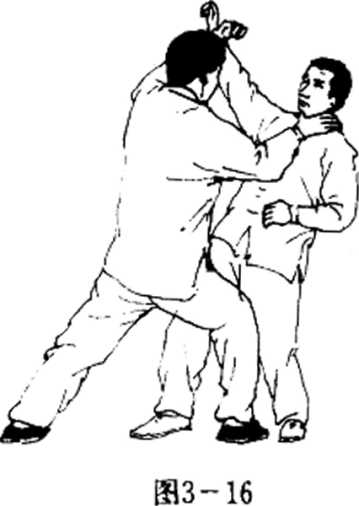 甲乙两人对面站立。甲右脚前进一步用右拳使 单风贯耳式由外向内侧击乙颊部;乙左脚往后?退, 用左掌往上架拦甲右拳,同时用石掌(掌心斜朝向 前,丘指朝上)直形搓击乙胸,(图3-15)