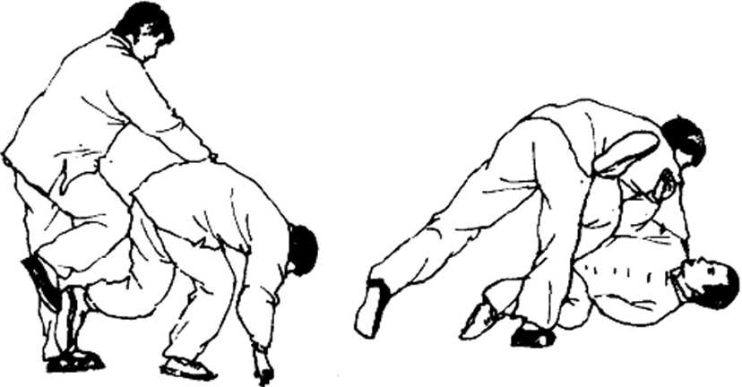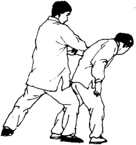 接上势.乙将甲左臂拧向身后不待甲变化迅速 提起右腿屈曲.以右膝盖撞击甲腰或臀尾部,双手 随腿撞往前一送将甲击出(图3-19);就在乙膝刚 一接髭甲被击部位,甲将左腿插入乙左腿外侧,迅 速地借乙撞击之势仰面摔倒,翻身并转体,用右臂 和右腿外侧面摆踢乙胯、肋、腿部将乙击倒。甲仰 面摔、倒插腿、摆踢要同时进行.切不可有先后。 (将I 3 - 20)