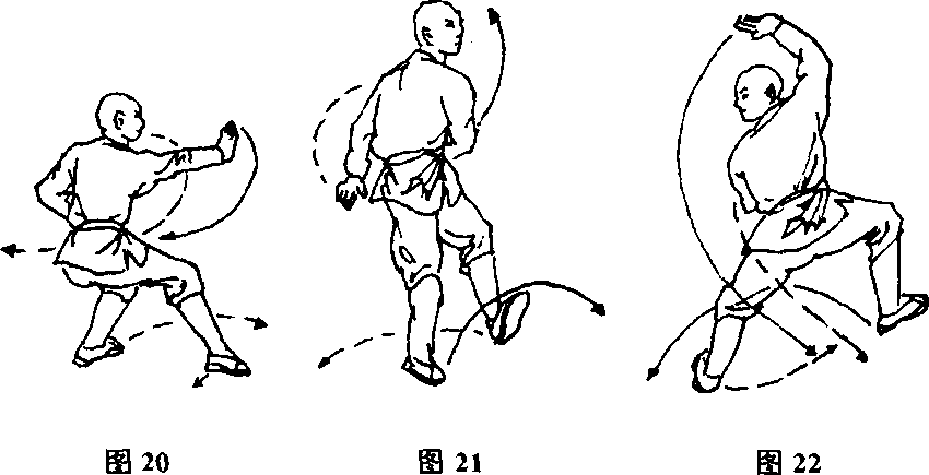 体右转90度,收右脚为虚步,同时右手向前推出,掌心向前, 左手屈肘抱腰侧,目视右手(见图20)。上动不停,右脚踏实,抬 左脚向前向右侧泼踢,同时,两手由右向左后下方甩劈(见图21)。 上动不停,左脚落于右脚后一步,两脚同时起跳(身向右转270), 两腿成右弓步,左掌变拳,由左向右屈肘横击,右掌向外向上划 弧,架于头上前方,拳心向前*目视左侧(见图22)。