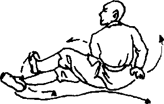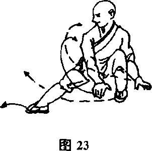 左脚向后撤一步,以左腿为轴,两手随身按地,右腿向左扫 半圈,体左转180度(见图23)。上动不停,先将两手移于右腿右 下方按地,(左腿全蹲右腿仆地),两脚同时抬起,身体向右翻转 180度,使两腿成插步形卧地,左脚在上,右脚在下,使腿胯部着 地,目视两脚(见图24)。