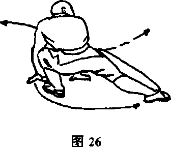 上动不停,起身,体右转90度,两腿变成左弓步,两掌变拳, 抱于腰间(见图25)。上动不停,体左转90度,左腿全蹲,右腿伸 直成右仆步.以左脚为轴,右腿向左扫一圈(见图26)。
