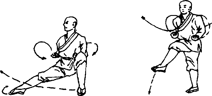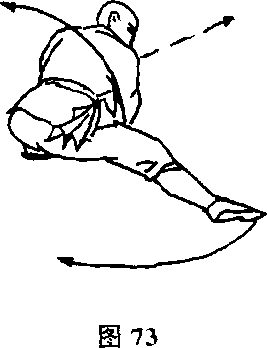体左转,右脚前上一步,体再左转90度,左腿全蹲,右腿伸 直成仆步,两手按于左腿左侧地上,以左脚为轴,伸右腿由右向 前,往后扫旋,体左转360度(见图73)。