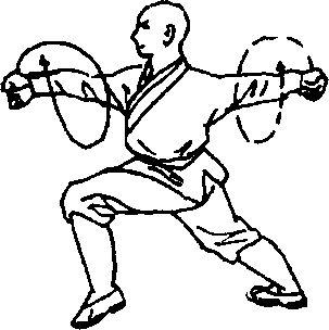 左脚踏实,右脚向前上一大步屈膝成右弓步,左勾手变掌,两 手由胸前向两侧同时推出,臂与肩平?,掌心向外,掌指向上,H 视前方(见图67)。