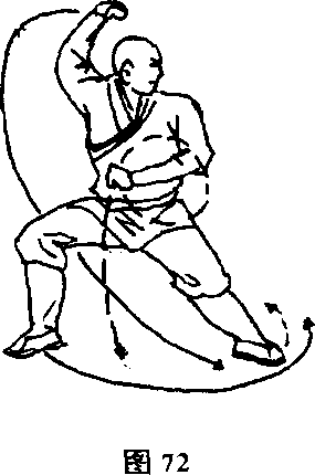 左弓步不变,两拳回胸向左右两侧屈肘崩出,右拳心向下,左 拳心向外(见图71)。上动不停,两脚同时起跳,向左转体270度, 落成右弓步、右拳由下向上,架于头上右侧,拳心向前,左拳由 左向右屈肘横击,拳心向下,目视左侧(见图72)。