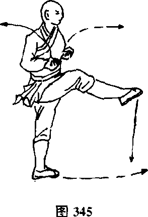 左脚不动,右拳变掌,向前抓搂,然后变拳抱于腰间,同时 抬右脚向前弹踢(见图345)。