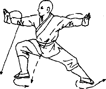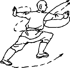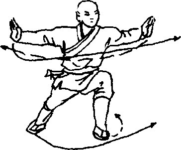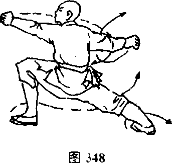 体左转90度,抬右脚向前踮一步,成右弓步,两手在胸前坏 弧,然后同时向身前、后展出,右手在前,左手在后,两掌心向 外,目视右手(见图347)。