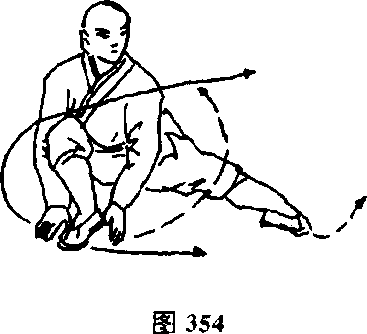 两脚碾地,体右转180度,变左脚为虚步,两手随身回胸前 环弧,右手由下向匕架于头上后方,掌心向上,左掌由上向下、问 后甩成后勾手(见图351)。