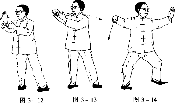 1 .腰向西南方转动,右掌也转向西南,然后全身略向 西南倾。右掌向同一方向推出,臂成半圆形,右脚尖移向西 南,脚跟随之旋转,然后落平。左脚不动,成丁字步。右掌中 指根对鼻尖,左手指尖仍贴于右腕,掌心转向上,成阳掌。 眼看右手背部,全身重量放在右腿上。(图3—12)