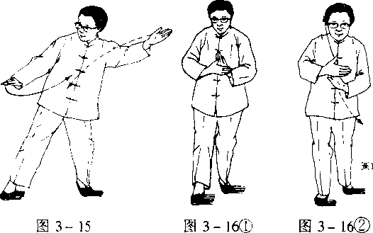 1 .左脚跟转动,脚尖挪向正面,全身重量移于左腿。左 手掌心转向上,背向左靠,右腿伸直,右手爪伸开,手心向 右下按,眼转向右手背部。(图3—15)