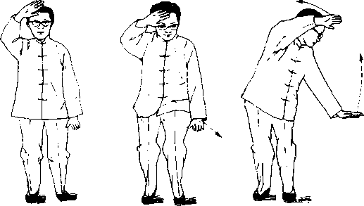 2 .平行步不变,腰向左转,头部转向东方,右手仍在 额顶,左手指转向正东,眼看左手背部。(图3—19)