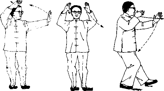 要领:本式两手随腰转动,要求动作配合均匀。虽然 是平行步,但重要的是练中定功夫,学者不可不重视。