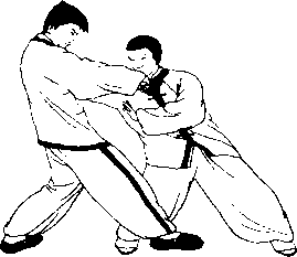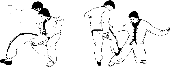 (3)扯肘拉脚:甲右侧身躲闪乙右肘,同时又用左手扯住其右肘 尖,左脚勾住乙右脚向右后扯拉,称此为“黄鼬拉鸡”,如图2 — 84。