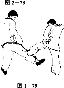 (2)抽撤步截腿:当甲右脚摧踢时, 乙右脚贴地抽撤,左脚高提以左脚掌外 侧截踢甲右腿前梁,如图2 — 79。