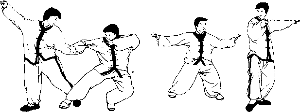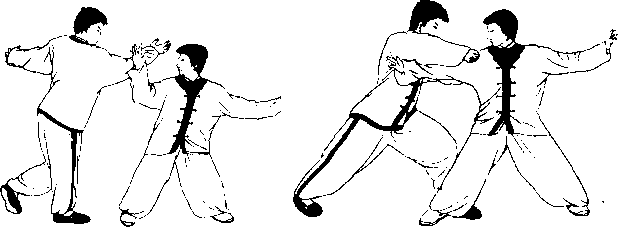 (1)击步蹬胯:甲做“击步蹬胯”动作,请读者参看本书第二章第 一节“三、2.蹬胯弹踢(1)击步蹬胯”动作说明及图2—75。