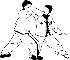 (3)闪身反臂捶:甲右肘被乙推住后,随即左腿一弓,上身向左歪