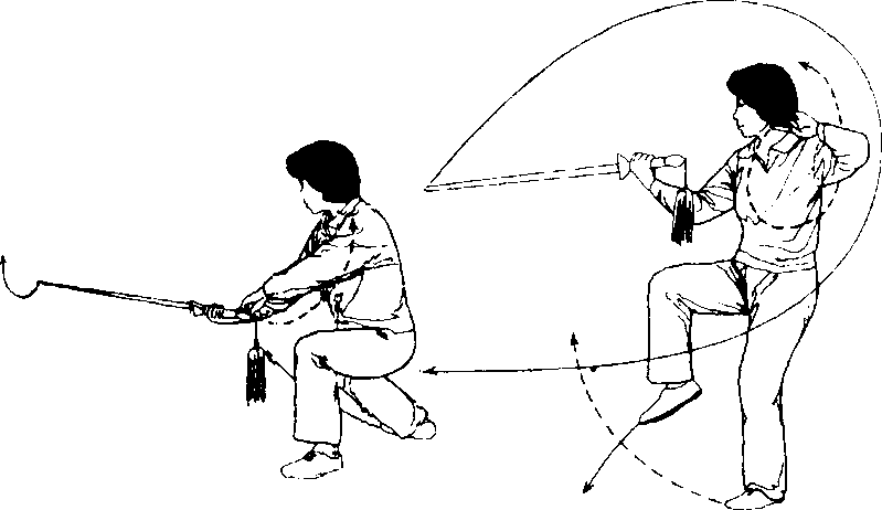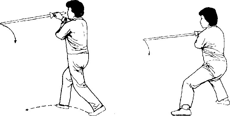 (1) 右脚以脚跟为轴,脚尖 外摆,身体右转,左脚跟提起。 同时右前臂内旋成俯握剑,剑 柄同肩高,剑尖朝右前,左剑指 向前下划弧附于右腕部,手心 朝右下方。目视剑尖方向。