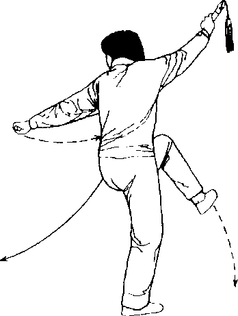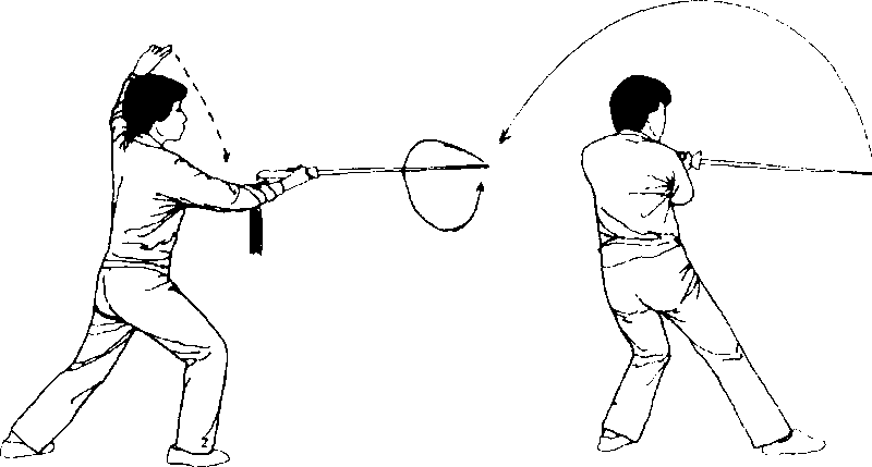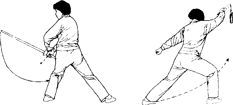 (1)身体重心移向左腿、右 腿再左腿,上体微左转、右转再 左转,右脚尖微扣;同时右臂微 屈,右手剑向左回带,左剑指附 于右腕上,随体转右手剑继续 向下向右向上向左划弧回带,