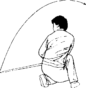 经胸前内旋,使剑向上向左后 划弧下落,剑柄同腰高。随之左 脚以脚前掌为轴,脚跟向外拧 转,左腿蹬直,身体右转成右弓 步。同时右手剑继续向下向右 向上划弧提到剑于胸前,剑柄 与右额同高,剑尖朝左上方;左 剑指向下向左划弧于左胯旁, 手心斜朝下。目视左下方。