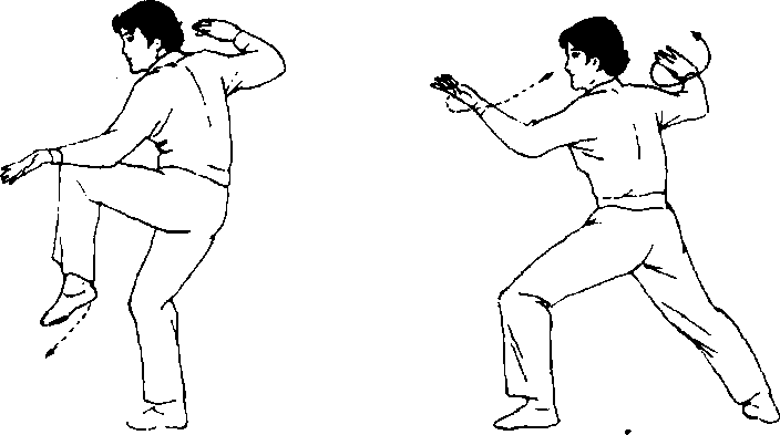 (7) 上动不停,重心全部移 至右腿,上体右转(胸朝西北), 左腿屈膝上提,膝同腰高,脚尖 自然下垂。同时左掌外旋,向 前、向上划弧于左膝外侧,掌心 朝左上,指尖朝左下方。右掌向 右、向后划弧至身体右前方,掌 稍高于肩,掌心朝外,指尖朝左 前方。目视左掌。