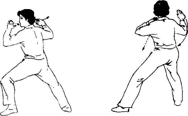 (2)上动不停,重心继续移 向右腿,身体右转(胸朝北),同 时左掌继续稍向右、向下划弧 于左肩前,掌心朝右前方,指尖 朝右上方。右掌继续向右、向前 划弧,掌稍高于肩,掌心朝前上 方,指尖朝后上方。目视右前 方。