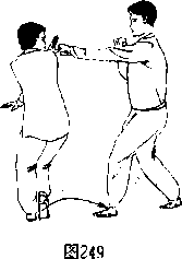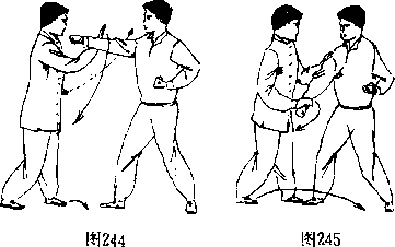 乙方上步出右直拳击向甲胸。(图244)甲方先出右手 拦截,并粘而向右下捋化,随即出左手粘附乙方右肩向右 “倒”化。(图245)