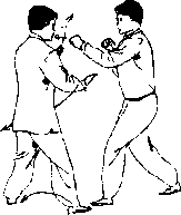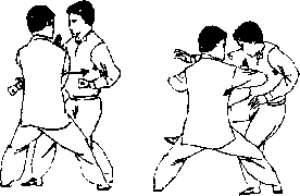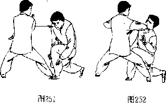 乙方前脚受击,必俯身欲救,头一低,甲右脚踩压乙脚不 收,双臂屈肘,右肘向右顶击乙方面部。(图251,252)
