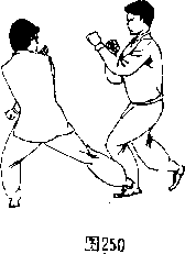 乙方上步出左直拳击向甲方头部。(图248)甲方右脚 内收,靠于左脚内侧,身体左转并蹲步沉身以避乙拳。乙拳未 击倒甲,刚一收拳,甲方乘势右脚向右踩蹬乙方前腿胫骨及其 脚面。(图 249,250),