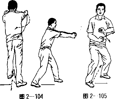 左脚朝北上步,右脚跟步,面朝北成三角步。同时两拳略收, 均成单珠拳前冲,拳高及肩,两拳心左右相对。眼视正北。(图2- 104)
