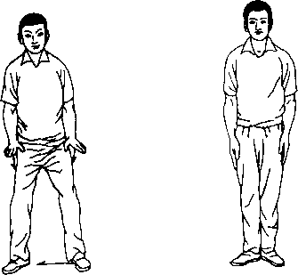 2. 左脚收靠右脚,成立正姿势。丘指并拢贴靠于两腿外侧。