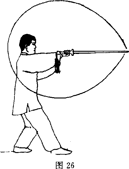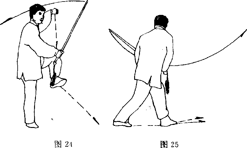<1)接上势,左脚向左前方落步;上体向左转;同时右手持剑 经上向左后方挥摆,剑尖向后;左剑指随之下落附于右腕;头向左转,目视剑尖(图25)。(2)上体向右拧转;右脚向前上一步,左脚跟进半步成顺三 体式步;同时右手持剑继续经下向前立刃撩出,剑尖向前,高与 肩平;左剑指仍附于右腕;目视剑尖(图26)。[要点]落步、跟步要连贯,撩剑要贴身走立圆。